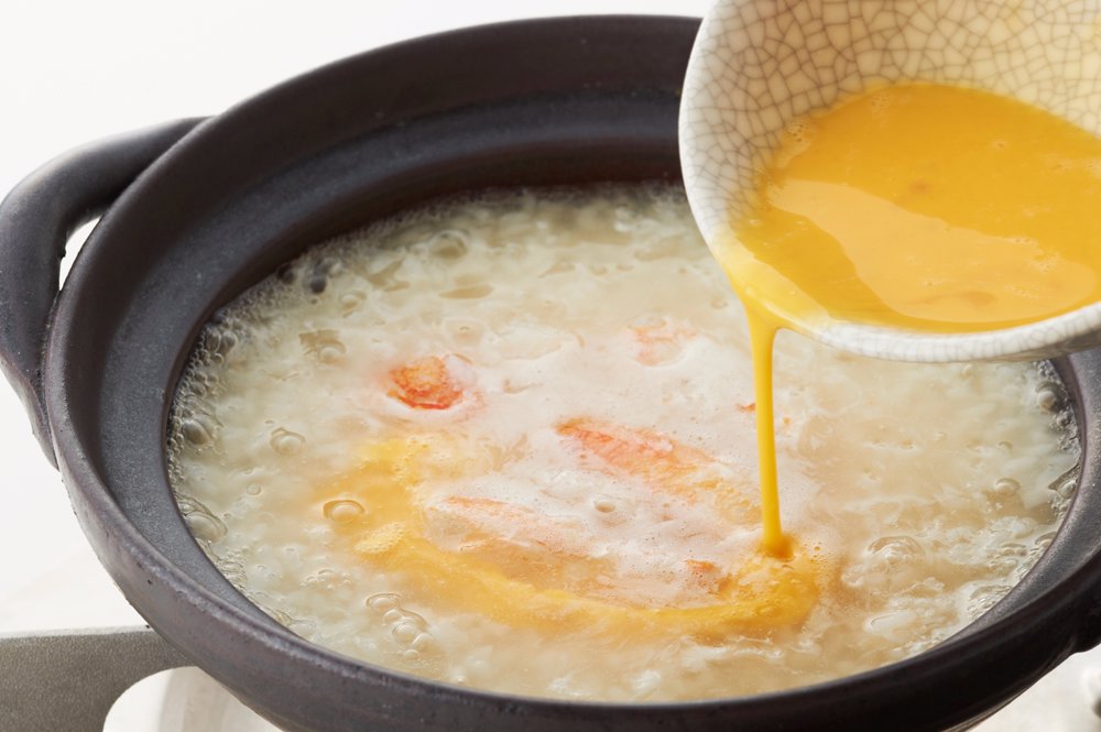 ③沸騰する前に、ご飯約300g(茶碗約2杯分)と 解凍した「かに肉」を入れ沸騰させます。