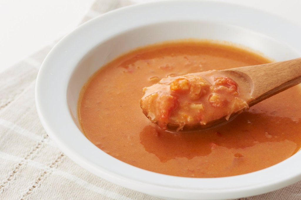 まるずわいがにの殻と身を、白ワインで焼きつけて、じっくり丁寧に出汁を取り、さらに、セロリなどの香味野菜、玉ねぎ、人参などからとった旨味たっぷりの野菜スープを合わせて煮込み、トマトベースで仕上げました。 一般的な「ビスク」は、殻から出汁を取りますが、当社の「ビスク」は、殻だけでなく、贅沢に蟹の剥き身も入れて出汁を取っています。